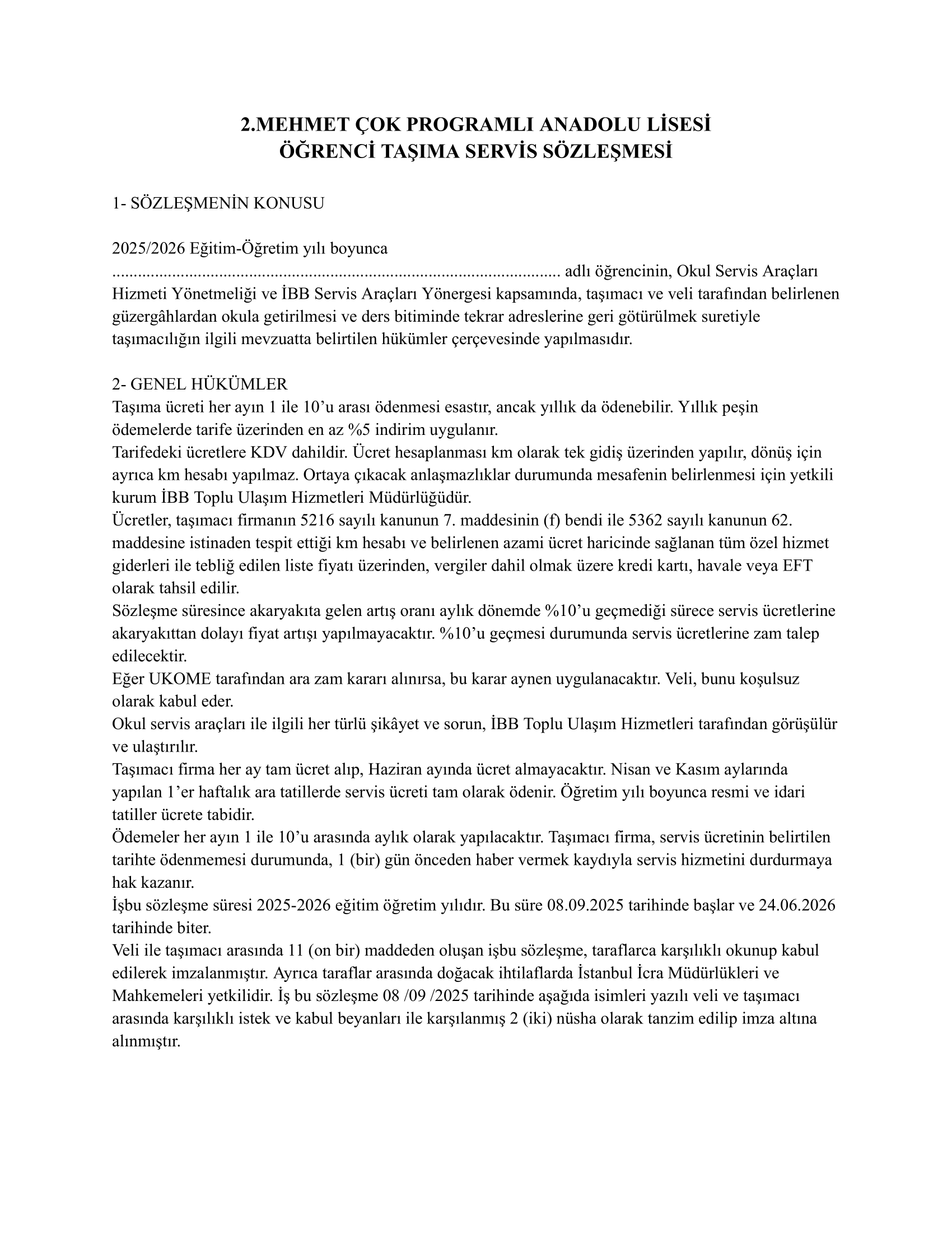 2.Mehmet Öğlenci Öğrenci Servis Kayıt Formu